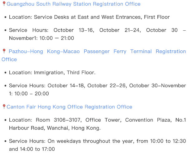 Additional registration points are available at Guangzhou South Railway Station, the Pazhou-Hong Kong-Macao Passenger Ferry Terminal, the Canton Fair Hong Kong Office, and 60 designated hotels.