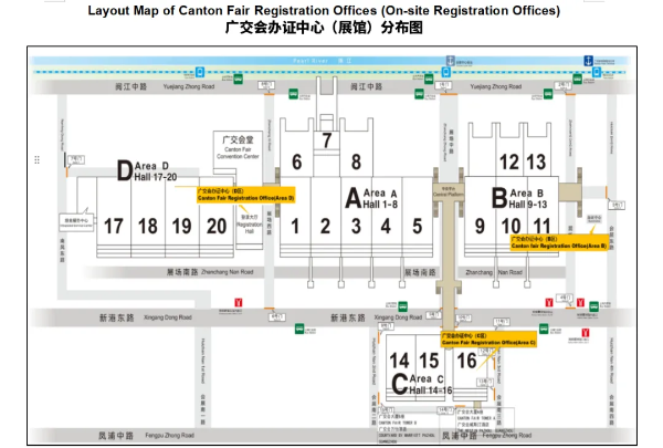 ID badge centers are located in Areas B, C, and D for new badge applications and the replacement of old ones. The closest metro station exits are Exits A and B of Pazhou Station on Line 8 or Exit F of Line 11, Exit C at Pazhou Station on Line 8, and Exit A of Xingangdong Station on Line 8, respectively.