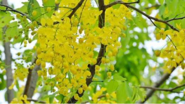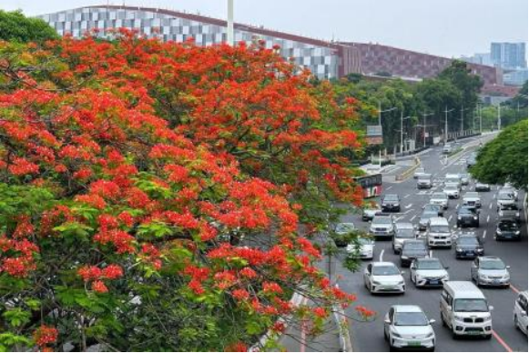 In early summer in Guangzhou, despite continuous rain, it cannot stop the blooming flowers from shining brightly. The flamboyant flowers that burn like flames, the golden shower flowers dressed in golden dance clothes, and the layered new green make up the excellent color scheme of the Flower City at this time. Flamboyant flowers bloom everywhere in the streets, parks, and residential areas, with flowers blooming all over the trees like flames, flourishing with endless vitality. At this time, in the Flower City, the golden shower flowers, known as the "golden rain," quietly bloomed, complementing the red flamboyant flowers.