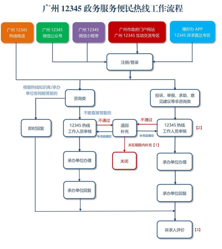 廣州12345政府服務熱線受理中心負責廣州12345政務服務便民熱線的日常運行管理工作。區(qū)人民政府、市人民政府各部門以及法律法規(guī)授權具有管理公共事務職能的市直屬事業(yè)單位為熱線事項的承辦單位,負責辦理熱線事項。中央駐穗行政機關、人民團體、社會組織以及承擔公共服務職能的國有企業(yè)可以參與熱線事項辦理。