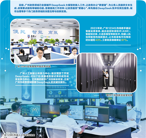 2025年1月,廣州完成全國首個政務(wù)領(lǐng)域的DeepSeek國產(chǎn)化適配。目前,廣州政務(wù)領(lǐng)域已全面鋪開DeepSeek大模型的接入工作,率先推動DeepSeek技術(shù)在民生服務(wù)、城市治理等多個熱門政務(wù)領(lǐng)域的深度應(yīng)用與創(chuàng)新實踐。