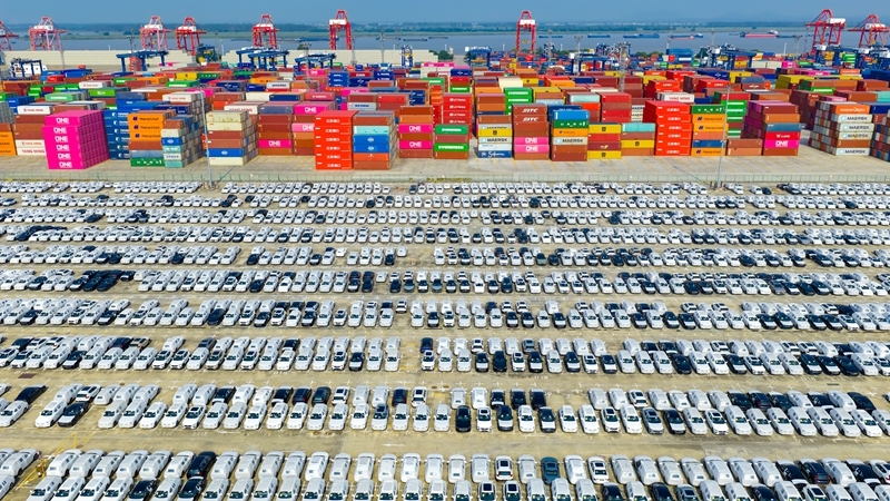 2025年10月4日在江蘇省港口集團南京港龍?zhí)陡蹍^(qū)拍攝的準(zhǔn)備裝船出口的汽車(無人機照片)。