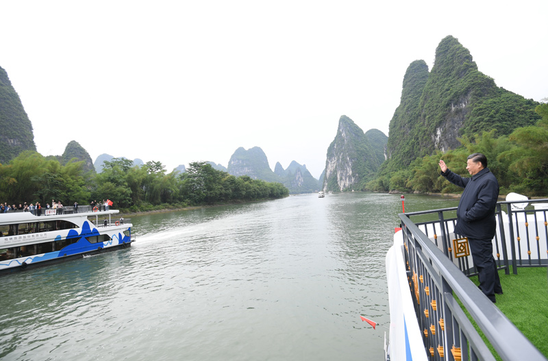 近年來(lái),桂林市大力推進(jìn)漓江“治亂、治水、治山、治本”,改善了漓江生態(tài)環(huán)境。25日下午,習(xí)近平來(lái)到桂林市陽(yáng)朔縣漓江楊堤碼頭,聽(tīng)取漓江流域綜合治理、生態(tài)保護(hù)等情況匯報(bào),并乘船考察漓江陽(yáng)朔段。他強(qiáng)調(diào),要堅(jiān)持山水林田湖草沙系統(tǒng)治理,堅(jiān)持正確的生態(tài)觀、發(fā)展觀,敬畏自然、順應(yīng)自然、保護(hù)自然,上下同心、齊抓共管,把保持山水生態(tài)的原真性和完整性作為一項(xiàng)重要工作,深入推進(jìn)生態(tài)修復(fù)和環(huán)境污染治理,杜絕濫采亂挖,推動(dòng)流域生態(tài)環(huán)境持續(xù)改善、生態(tài)系統(tǒng)持續(xù)優(yōu)化、整體功能持續(xù)提升。