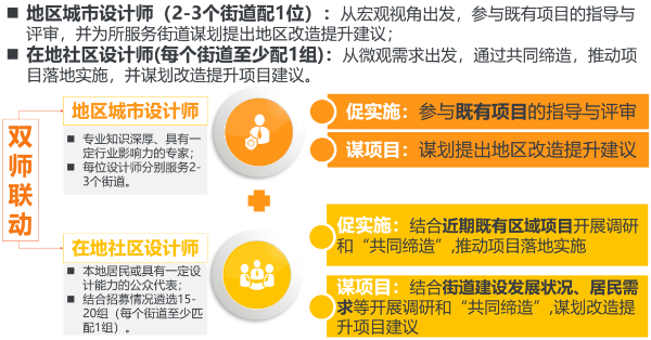 越秀區(qū)創(chuàng)新構(gòu)建“地區(qū)城市設(shè)計師+在地社區(qū)設(shè)計師”雙師聯(lián)動工作矩陣,形成宏觀與微觀協(xié)同的治理網(wǎng)絡(luò)。地區(qū)城市設(shè)計師從全區(qū)發(fā)展目標出發(fā),為2-3 個街道提供改造提升戰(zhàn)略指導;在地社區(qū)設(shè)計師則扎根街道,以“共同締造”模式推動民生項目落地。這種“自上而下”與“自下而上”的雙向聯(lián)動,已在社區(qū)小公園改造、歷史文化街區(qū)更新等項目中顯現(xiàn)成效,實現(xiàn)從“政府主導”到“多元共治”的治理轉(zhuǎn)型。