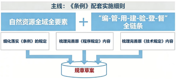 《程序和技術(shù)規(guī)定》的定位是《條例》的配套實(shí)施細(xì)則,立法思路是全面落實(shí)《條例》要求,完善程序與技術(shù)方面的管理規(guī)范,實(shí)現(xiàn)對(duì)自然資源全域、全要素、全鏈條的管理。