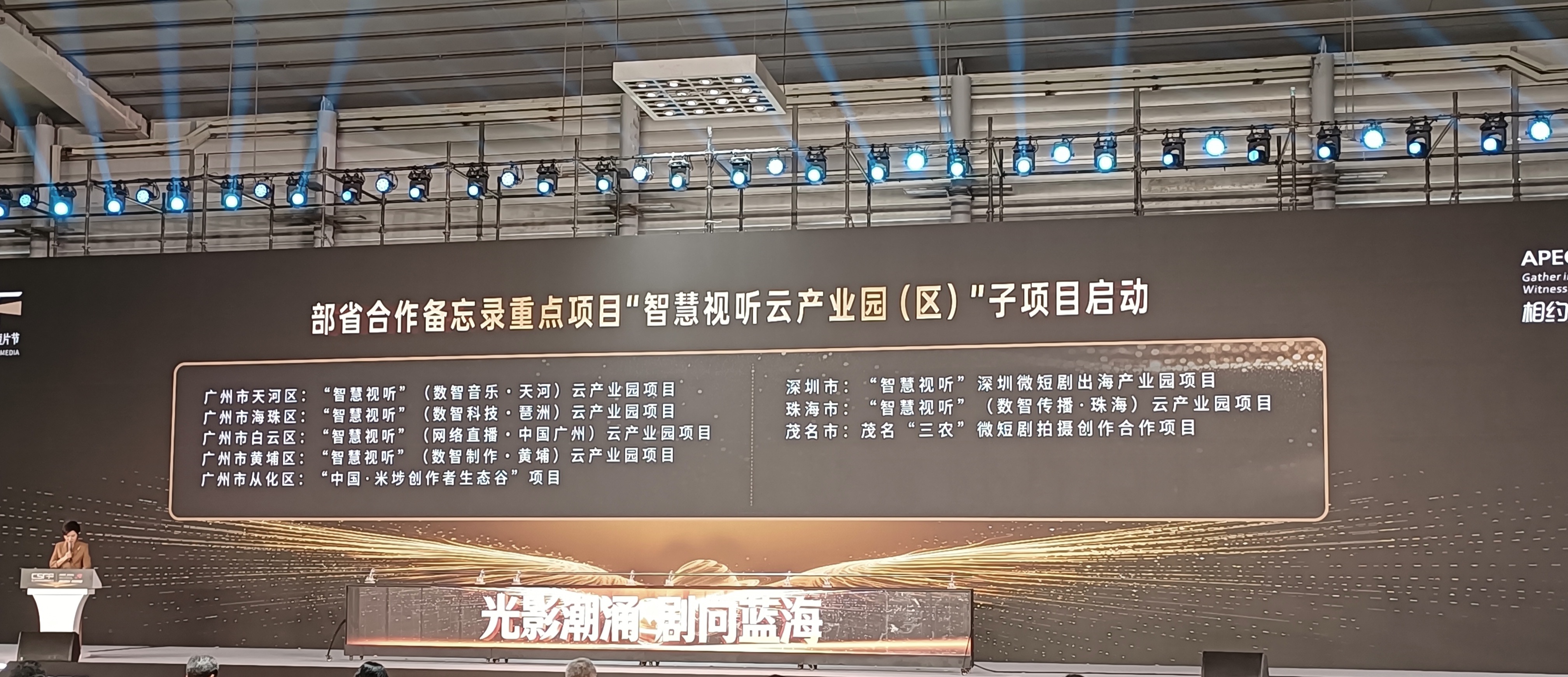 3月15日,在深圳第十五屆中國(guó)國(guó)際新媒體短片節(jié)開幕式上,廣東省部合作備忘錄重點(diǎn)項(xiàng)目“智慧視聽”云產(chǎn)業(yè)園(區(qū))子項(xiàng)目啟動(dòng)儀式舉行。廣州、深圳、珠海、茂名4市共8個(gè)子項(xiàng)目集中啟動(dòng),其中廣州市5個(gè)項(xiàng)目同步亮相啟動(dòng),標(biāo)志著廣州"智慧視聽"云產(chǎn)業(yè)園(區(qū))建設(shè)取得階段性重要成果。