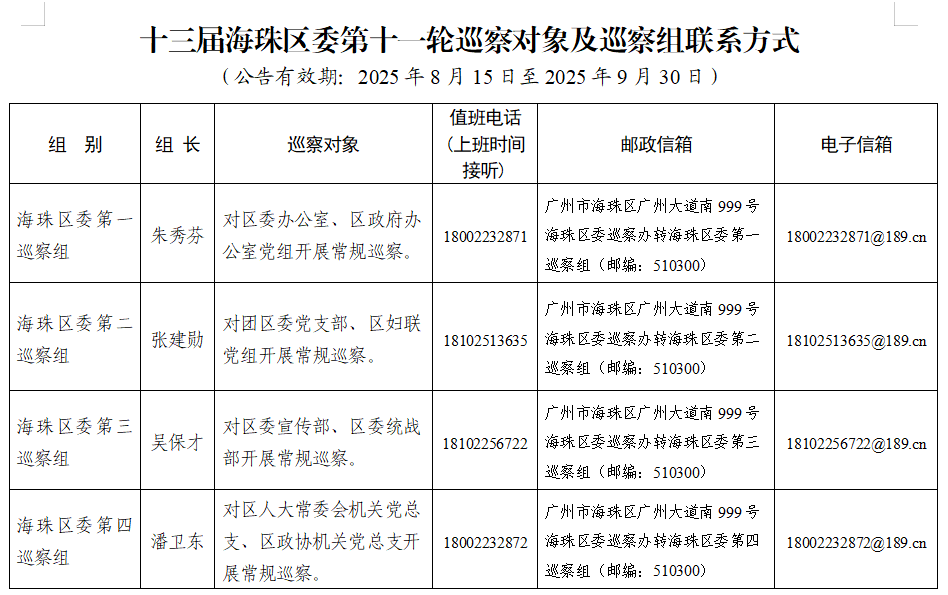 本輪巡察從2025年8月15日開始,2025年9月30日完成現(xiàn)場巡察工作。巡察組受理信訪時間截至2025年9月30日。海珠區(qū)委巡察辦公布了各巡察組的組長名單以及在巡察期間設(shè)置的值班電話、郵政信箱和電子信箱。