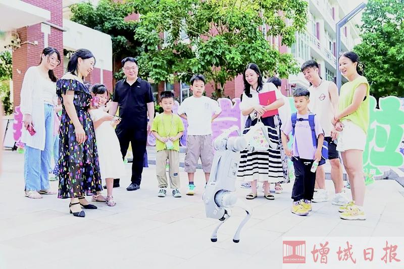 在增城區(qū)鳳凰城中英文學校,學生和家長近距離觀看機器狗表演,感受科技魅力。
