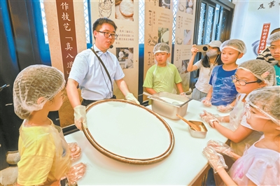 “用石磨磨米漿、把竹簸箕上的米漿搖勻,太好玩了,我還想繼續(xù)體驗(yàn)!”暑假期間,新港路小學(xué)四年級(jí)的龔?fù)瑢W(xué)跟媽媽李女士來(lái)到廣州市文化館廣繡園,參與沙河粉傳統(tǒng)制作技藝親子體驗(yàn)活動(dòng)。在專業(yè)講解員帶領(lǐng)下,她們一起認(rèn)識(shí)沙河粉起源、發(fā)展與師徒傳承等文化,了解非遺美食的來(lái)之不易。