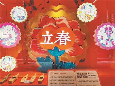 “廣州餅印制作技藝”的金魚(yú)形餅印,與年畫(huà)《金玉滿(mǎn)堂》里正在與玻璃魚(yú)缸中的金魚(yú)玩耍的胖娃娃組合,人財(cái)兩旺、生活富足的樸實(shí)愿望撲面而來(lái);威猛的醒獅前,是從年畫(huà)里“走”出來(lái)的、挑著燈籠的孩子,一派活潑、歡欣的氣象;廣府插花制作技藝、廣式硬木家具制作技藝相關(guān)的作品與天津楊柳青百年老年畫(huà)《對(duì)格博古》對(duì)照,迎春時(shí)的精雅,“清供”里的文韻清新流露……記者看到,每個(gè)櫥窗里的年畫(huà)雖然來(lái)自不同的地方,但與旁邊的廣府年俗結(jié)合起來(lái),那些二維平面上的古老圖像,仿佛一下子跳到了三維空間中,讓人們對(duì)年俗中蘊(yùn)藏的世情百態(tài),有了更深入的認(rèn)知。