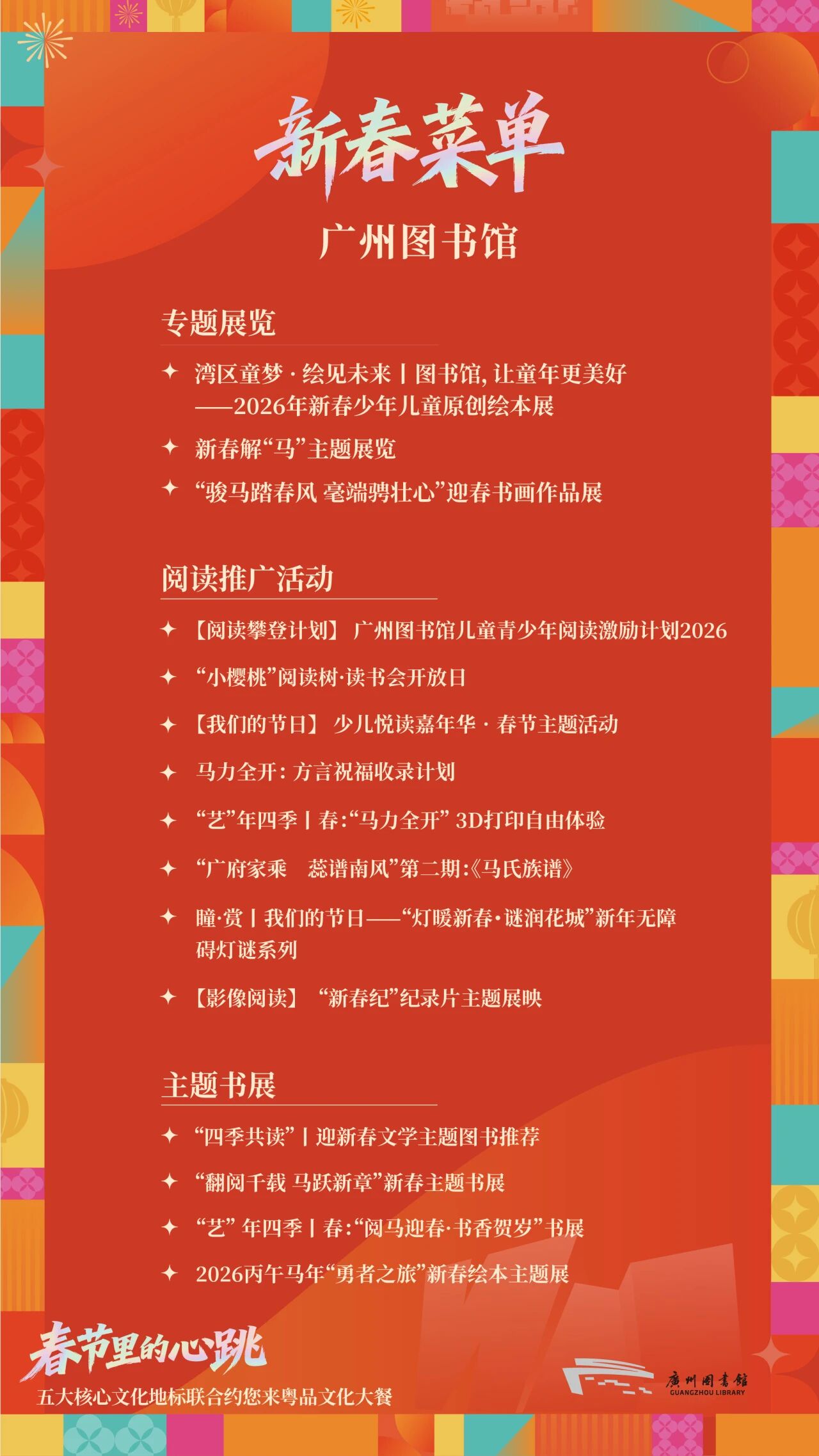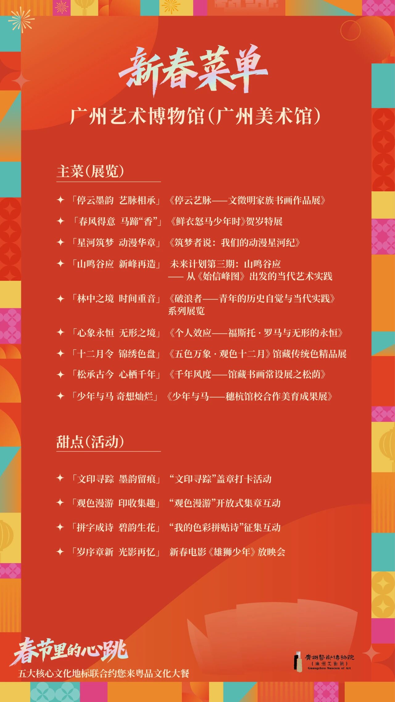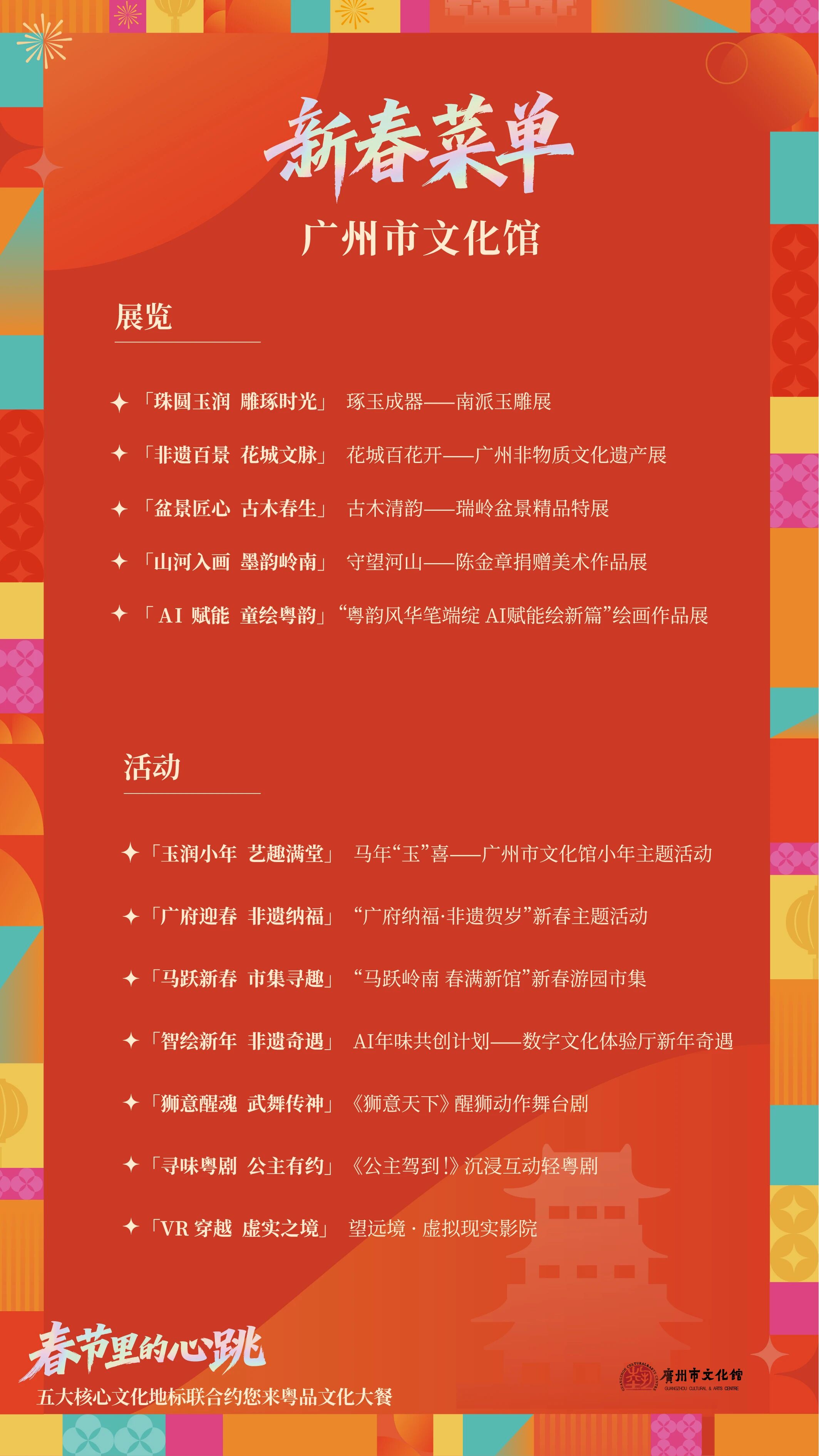 廣州中軸線五大核心文化地標(biāo)——廣州藝術(shù)博物院(廣州美術(shù)館)、廣東省博物館(廣州魯迅紀(jì)念館)、廣州圖書館、廣州市文化館、廣州大劇院聯(lián)合發(fā)布新春攻略,用一份誠意滿滿的“文化菜單”,向全國發(fā)出最誠摯的邀約:來花城,過個(gè)藝術(shù)年、文化年!