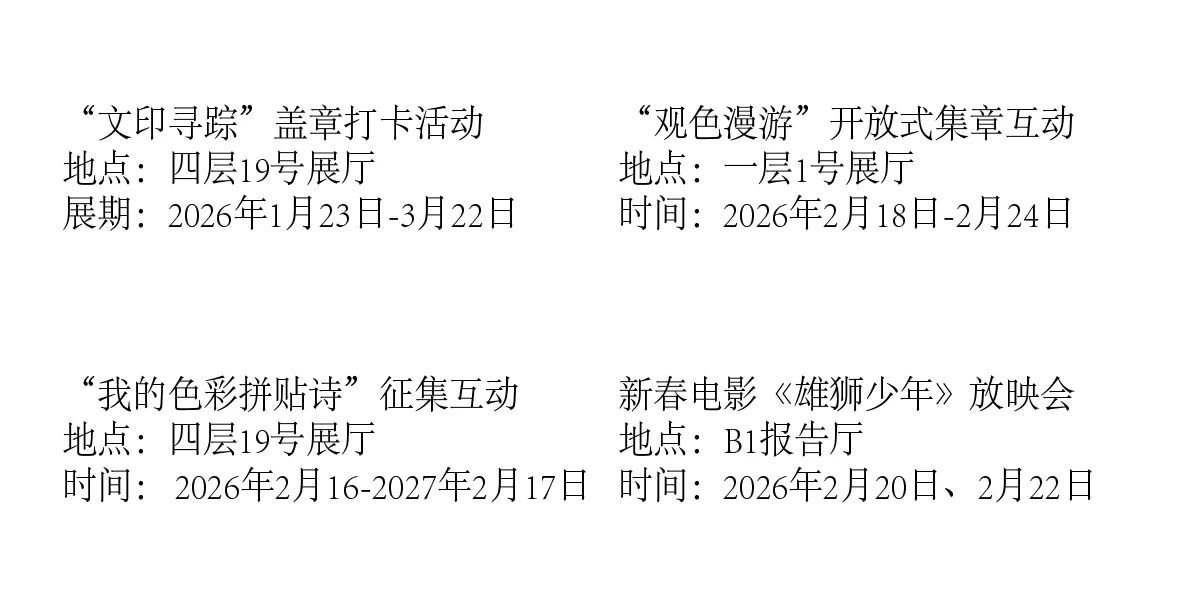 這份精心籌備的“文化菜單”匯集五館精華,涵蓋精品展覽、非遺體驗(yàn)、舞臺(tái)演出、書香品讀等多元內(nèi)容 ?!柏S盛佳肴”已備齊,下拉清單,挑選心儀之選。