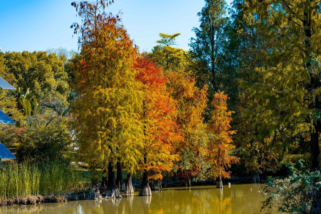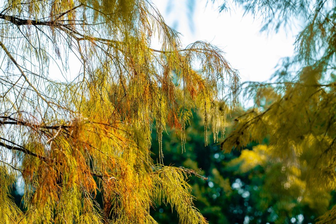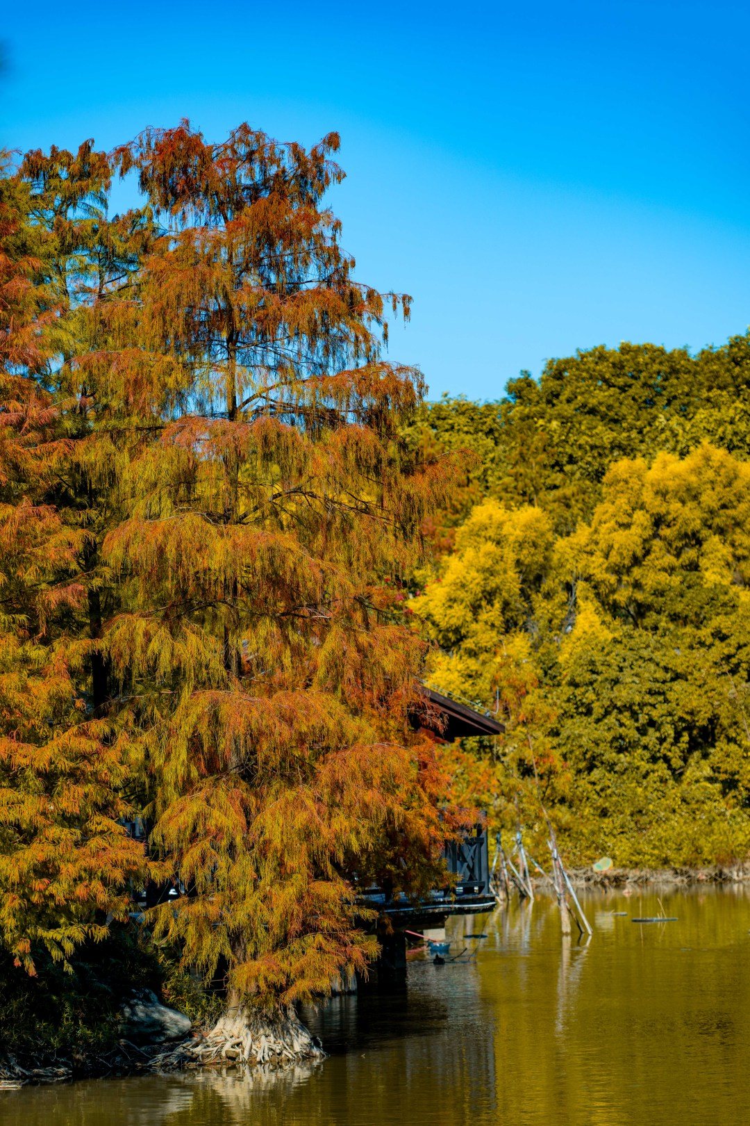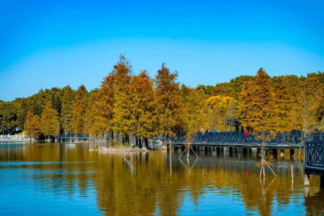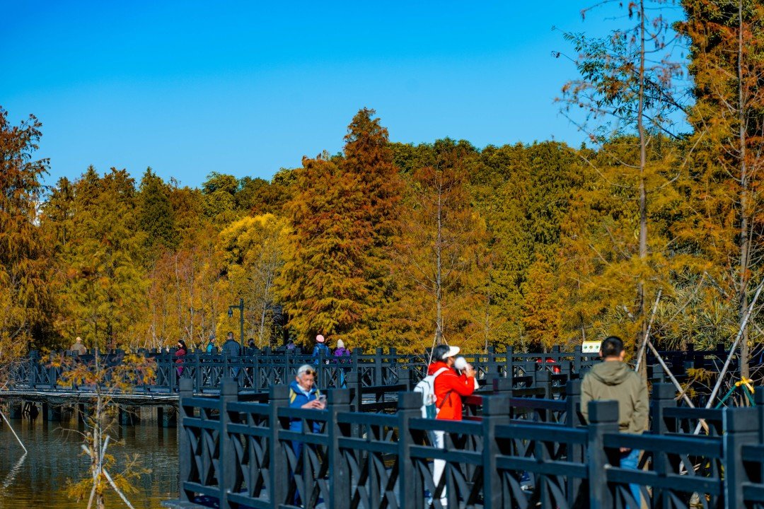 位于濕地一期的友誼林及內河道聚龍灣,則以成排壯觀的杉林和靜謐的河道景觀著稱。焦糖色的枝葉垂落水面,陽光透過縫隙灑下斑駁金芒,綠水與紅杉相映,營造出宛如童話世界的氛圍。此處被許多攝影愛好者譽為“城市秘境”,樹干倒映在碧綠水中,色彩濃郁和諧,出片率極高。