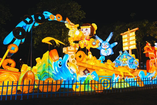 園區(qū)內(nèi)花燈風(fēng)格多樣。不僅穿越千年搬來(lái)大唐盛景、敦煌風(fēng)情,還解鎖了45000㎡宇宙星河夢(mèng)幻場(chǎng)景,更請(qǐng)來(lái)奶龍、喜羊羊、魯班七號(hào)等超人氣動(dòng)漫/游戲明星,大人小孩都能找到心愛(ài)的拍照背景!
