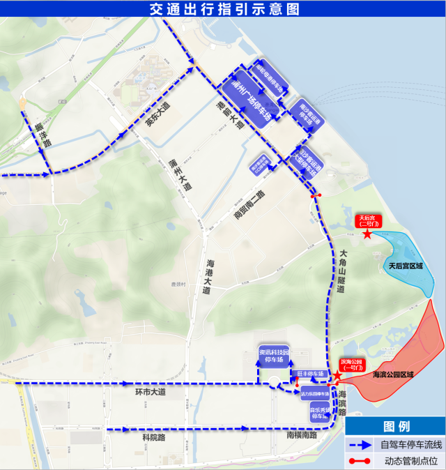 1.濱海公園(一號(hào)門(mén))與天后宮(二號(hào)門(mén))周邊設(shè)置有多個(gè)停車(chē)場(chǎng)。自駕前往的游客可按進(jìn)場(chǎng)需求導(dǎo)航至對(duì)應(yīng)停車(chē)場(chǎng),停車(chē)后步行進(jìn)入燈會(huì)參觀游覽。
