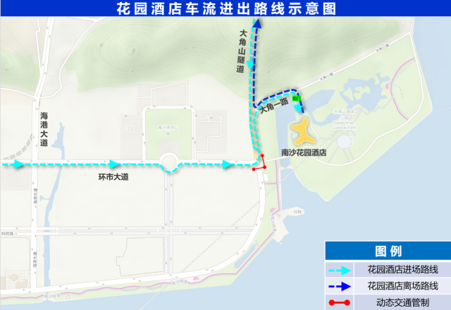 動(dòng)態(tài)管制路段:環(huán)市大道南(霍英東研究院路口至海濱路)西往東方向、大角山隧道(環(huán)市大道至南沙灣)南往北方向。
