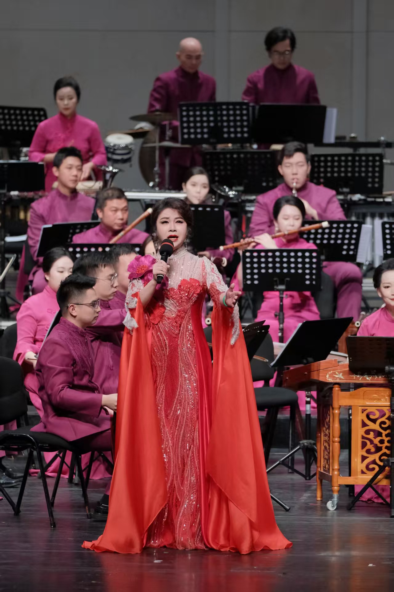音樂(lè)會(huì)特邀戲劇梅花獎(jiǎng)“二度梅”得主、粵劇國(guó)家級(jí)傳承人歐凱明驚艷亮相,將粵劇的腔韻融入經(jīng)典文學(xué)作品《將進(jìn)酒》的朗誦之中,輔以粵劇身段,在嗩吶與銅管樂(lè)伴奏中,讓詩(shī)與樂(lè)完美交融,為傳統(tǒng)粵劇在跨界演繹中煥發(fā)活力。文華獎(jiǎng)與牡丹獎(jiǎng)獲得者、“星腔”傳承人梁玉嶸傾情獻(xiàn)藝,一曲《漁舟唱晚》,歌聲與管弦樂(lè)交織,旋律舒緩,如夕陽(yáng)西下、漁舟歸航的寧?kù)o美景;而《滄海一聲笑》則畫(huà)風(fēng)一轉(zhuǎn),歌聲豪邁灑脫,樂(lè)隊(duì)伴奏鏗鏘有力,鼓點(diǎn)與弦樂(lè)的交響彰顯江湖豪情,剛?cè)岵?jì)的獨(dú)特韻味為經(jīng)典賦予嶄新的藝術(shù)生命力。