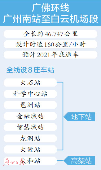 而建設(shè)中的廣佛環(huán)線廣州南站至白云機場段全長約46.747公里,設(shè)計時速160公里/小時。線路起于廣州南站,經(jīng)番禺區(qū)大石、科學(xué)中心,海珠區(qū)琶洲會展中心,天河區(qū)金融城、岑村、火爐山,白云區(qū)大源和太和,接入穗莞深城際鐵路竹料站。項目全線設(shè)車站8座,分別為大石站、科學(xué)中心站、琶洲站、金融城站、智慧城站、龍洞站、大源站和太和站,其中太和站為高架站,其余均為地下站。工程投資預(yù)估算總額260億元,工期5年,預(yù)計2021年底通車。