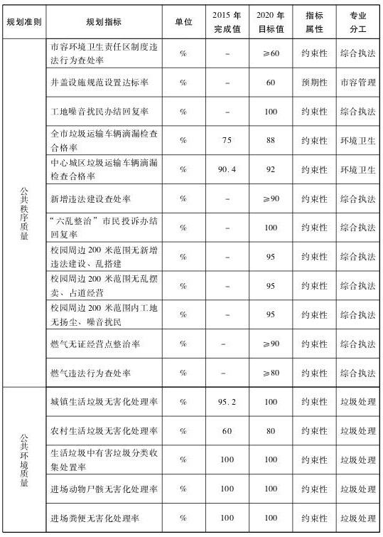 到2020年,基本形成“全面覆蓋、共享融合、敏捷高效、開放互動”智慧城市管理體系,公共設施支撐能力進一步提高,公共服務質(zhì)量大幅提升,公共秩序管理全面優(yōu)化,環(huán)境質(zhì)量持續(xù)改善,隊伍質(zhì)量明顯增強,城市綜合功能進一步增強,城市管理質(zhì)量大幅改善。戶外廣告設置規(guī)劃覆蓋全市,招牌設置整治工作覆蓋主要商業(yè)街區(qū),全市快速路和主次干道機械化清掃率達100%,全市城鎮(zhèn)生活垃圾無害化處理率達100%,農(nóng)村生活垃圾無害化處理率達80%,全市天然氣利用總量占一次能源消費總量的比重達到13%以上,全市城鎮(zhèn)居民燃氣普及率達到99.9%以上,全市城鎮(zhèn)居民管道天燃氣覆蓋率達到80%,新增違法建設查處率超過90%,工地噪音擾民辦結(jié)回復率達到100%,“六亂整治”市民投訴辦結(jié)回復率達到100%。