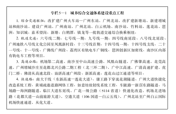 以構(gòu)建國際性綜合交通樞紐為目標,鞏固提升綜合性門戶地位,加快航空網(wǎng)、海運網(wǎng)、鐵路網(wǎng)、公路網(wǎng)等綜合交通運輸通道和重要樞紐設(shè)施建設(shè),加強城際交通聯(lián)系,形成航空、海運、鐵路、公路等多種交通方式高效銜接的現(xiàn)代交通運輸網(wǎng)絡(luò)。依托白云機場,發(fā)展與通用航空機場連接的航空通道,完善與高鐵樞紐、城際軌道銜接,建設(shè)復合型國際航空樞紐。加快黃埔新港、新沙港轉(zhuǎn)型發(fā)展,推進南沙港區(qū)集裝箱四期、江海聯(lián)運碼頭、廣州港出海航道等工程建設(shè),建設(shè)輻射華南、中南和西南地區(qū)的國際出海大通道。推動廣汕鐵路、深茂鐵路、廣河、廣湛客專等高快速鐵路和廣州樞紐東北貨車外繞線、南沙港鐵路等普通鐵路建設(shè),構(gòu)建由廣州站—廣州東站聯(lián)合樞紐、廣州南站、廣州北站、增城站、新塘站、南沙站組成的廣州鐵路客運樞紐新格局,積極推動廣州火車站和廣州東站兩站改擴建,擴建提升廣州北站,強化廣州南站高鐵樞紐輻射帶動,新建增城、南沙、擴建新塘鐵路綜合客運樞紐,增強城市“南進”和“東拓”的支撐和服務能力。建設(shè)廣清、佛莞、廣中珠澳、廣佛環(huán)、穗莞深、中南虎、肇順南等城際軌道交通,推進城際軌道互聯(lián)互通,構(gòu)建以廣州為核心的珠三角1小時交通圈。
