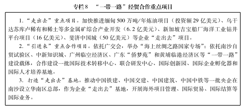 “一帶一路”和自貿(mào)區(qū)戰(zhàn)略機(jī)遇。國(guó)家大力實(shí)施“一帶一路”和自貿(mào)區(qū)戰(zhàn)略,中國(guó)—東盟自貿(mào)區(qū)升級(jí)版、CEPA(內(nèi)地與港澳關(guān)于建立更緊密經(jīng)貿(mào)關(guān)系的安排)、中澳自貿(mào)區(qū)等陸續(xù)實(shí)施,同時(shí)從國(guó)家層面提出加快南沙等粵港澳合作平臺(tái)建設(shè)、強(qiáng)化廣州國(guó)際航空樞紐以及批準(zhǔn)設(shè)立中國(guó)(廣東)自由貿(mào)易試驗(yàn)區(qū)南沙新區(qū)片區(qū),為我市打造“一帶一路”建設(shè)的橋頭堡、率先構(gòu)建開放型經(jīng)濟(jì)新體制提供重大契機(jī)。
