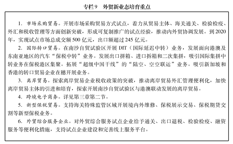 強(qiáng)化國(guó)際貿(mào)易功能創(chuàng)新集成。積極探索轉(zhuǎn)口貿(mào)易、離岸貿(mào)易、保稅貿(mào)易、保稅展示、保稅期貨交割、融資租賃、跨境電子商務(wù)、汽車平行進(jìn)口等新型貿(mào)易形態(tài),推動(dòng)南沙自貿(mào)試驗(yàn)區(qū)成為國(guó)際貿(mào)易創(chuàng)新的試驗(yàn)田和國(guó)際貿(mào)易功能集成區(qū)。大力推進(jìn)南沙跨境貿(mào)易電子商務(wù)產(chǎn)業(yè)園、臨港國(guó)際大宗商品交易中心、國(guó)際采購配送中心、汽車保稅中轉(zhuǎn)、進(jìn)口消費(fèi)品集散中心、汽車進(jìn)口口岸暨全球品牌汽車展覽中心、海工和重型裝備成套供應(yīng)和出??诨氐软?xiàng)目建設(shè),盡快形成貿(mào)易集聚效應(yīng)和外貿(mào)新增長(zhǎng)極。促進(jìn)服務(wù)貿(mào)易創(chuàng)新發(fā)展,培育一批創(chuàng)新發(fā)展的服務(wù)貿(mào)易龍頭企業(yè)和具備較強(qiáng)競(jìng)爭(zhēng)力的服務(wù)品牌;率先推進(jìn)與港澳服務(wù)貿(mào)易自由化,打造成為以穗港澳服務(wù)貿(mào)易自由化為主導(dǎo)的服務(wù)貿(mào)易創(chuàng)新發(fā)展核心區(qū)。
