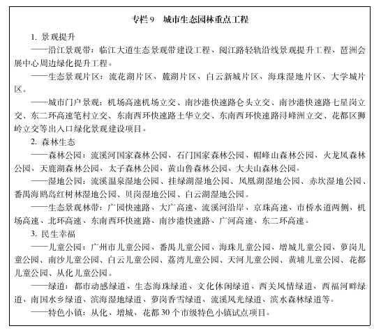 (三)提升公共空間的綠化品質(zhì),實施“森林圍城、森林進(jìn)城”行動計劃,建設(shè)花城花景、大型公園、開放式綠地、“一江兩岸”綠化景觀帶、四季主題花景,完善綠道網(wǎng)絡(luò)體系,發(fā)展立體綠化和鄉(xiāng)村綠化,形成嶺南園林城市的風(fēng)貌。